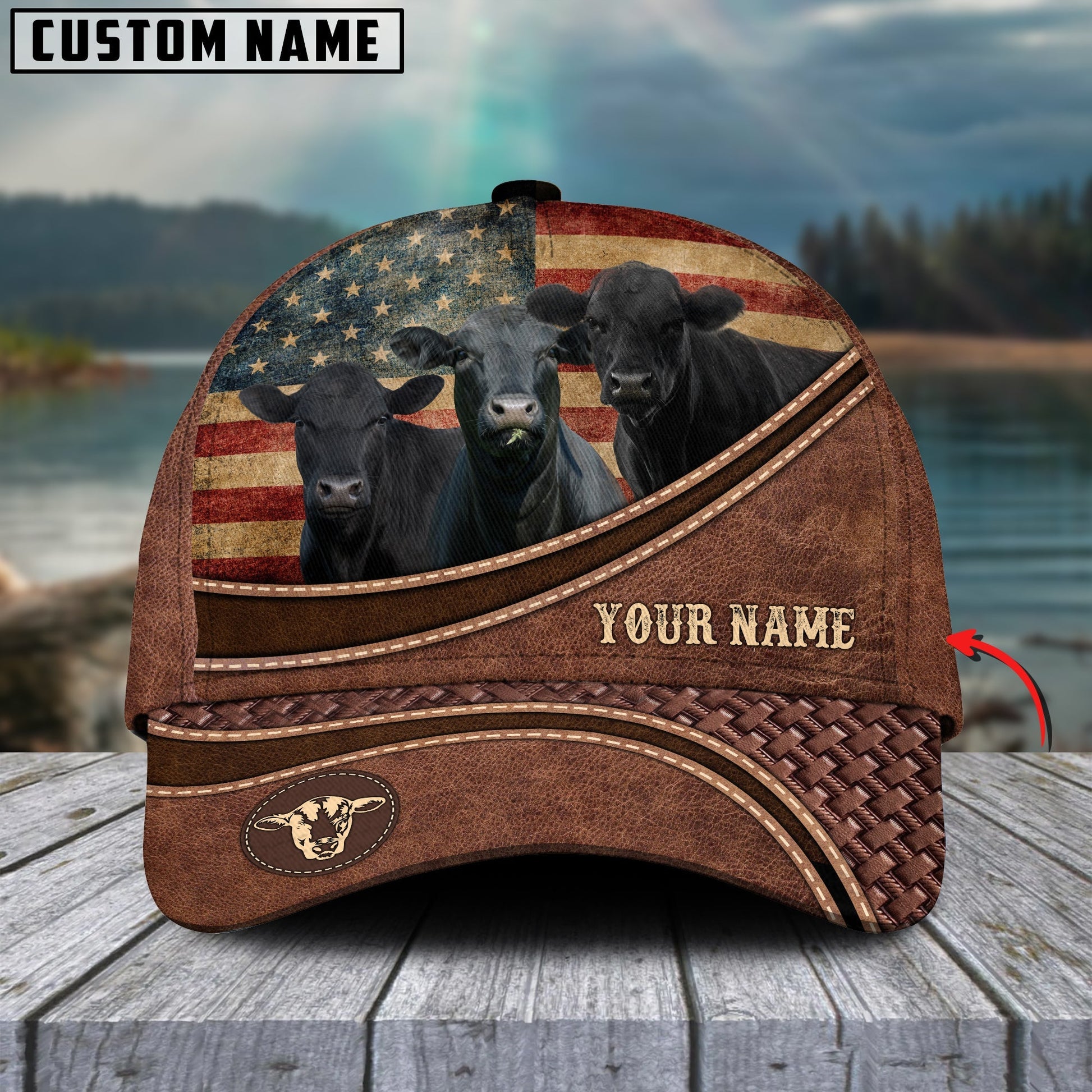 Novacare Black Angus US Flag Personalized Name Brown Carving Leather Pattern 3D Classic Cap