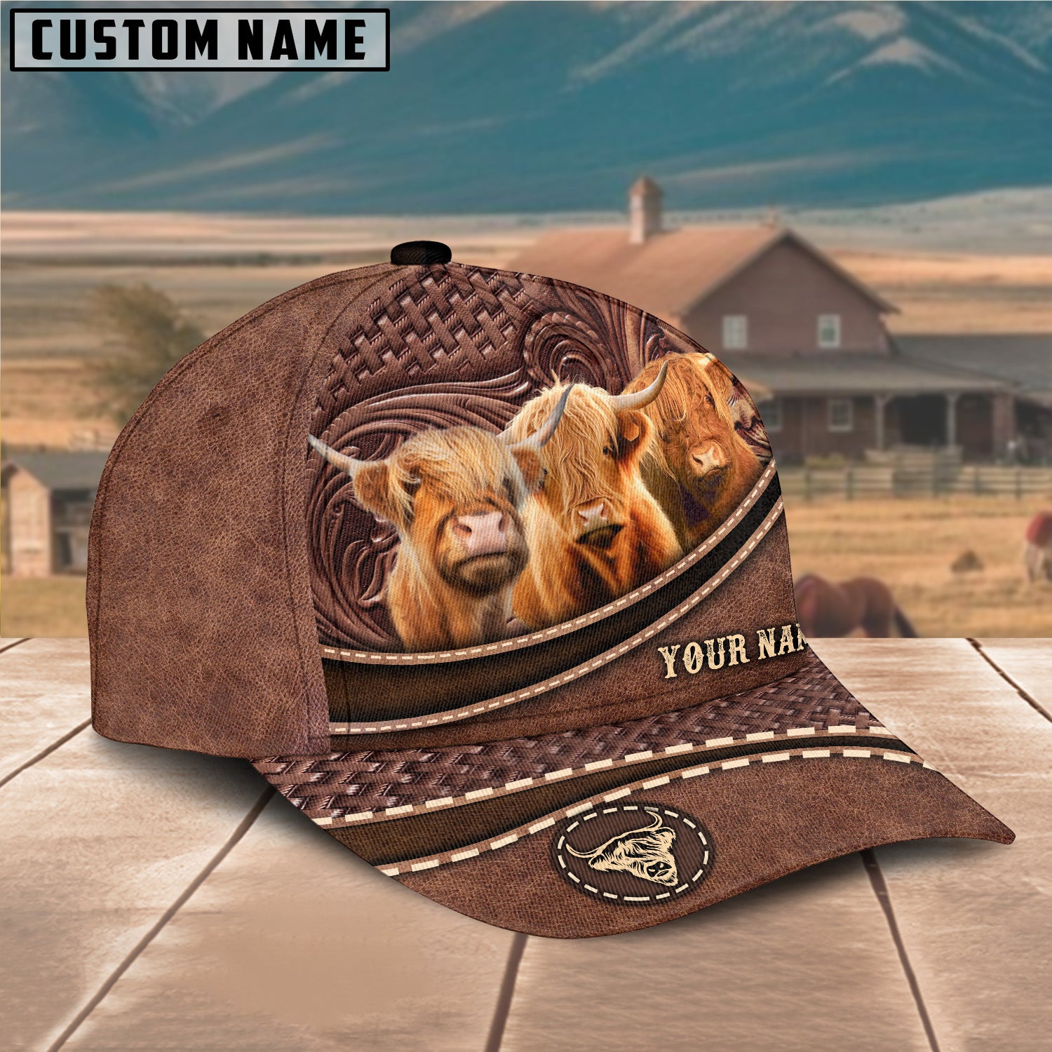 Novacare Highland Cattle Personalized Name Brown Carving Leather Pattern 3D Classic Cap